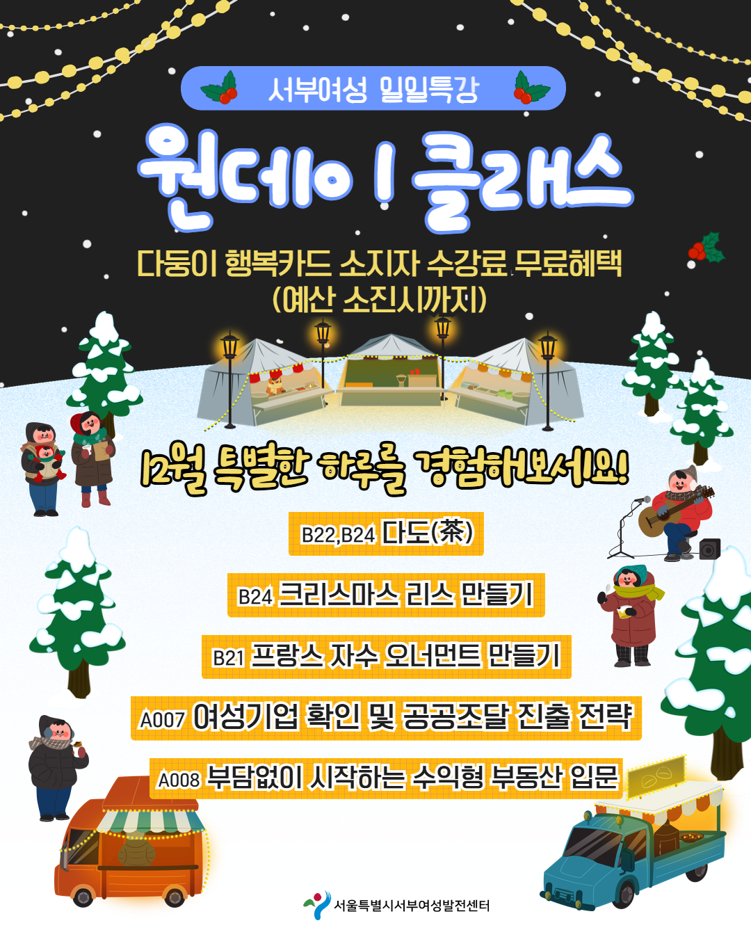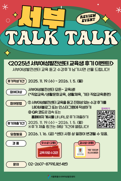 다중 게시판 공지사항 [공지] 2025년 101기(11월~12월) 교육생 만족도조사 실시 안내 [모집] 2026년 102기(1~3월) 교육생 모집 [공지] 2026년 1월~3월(102기) 우선순위자 접수 안내 [공지] 2026년 1월 생활체육교실 프로그램 안내 [모집] 2026년 102기(1월~3월) 신규강사 모집 공고 서부소식 서부여성발전센터 서울시 특화사업 K-웹툰 크리에이터 양성과정 홍보 웹툰! 서부Toon 7월호 서부 Magazine 7월호 서부 Magazine 6월호 서부툰 6월호 (클릭!!) 더보기
